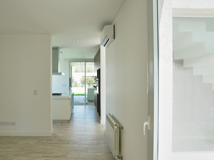A la derecha del ingreso principal está el baño de recepción y a la izquierda la escalera que sube recorriendo un vidrio en doble altura que mira al jardín de frente.
